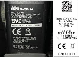 Zo samotného výrobného štítku bicykla s pomocným motorčekom je vidieť označenie technickej normy EN 15194 a tiež aj najväčšia rýchlosť 25 km/h a výkon 0,25 kW alebo 250 W.
